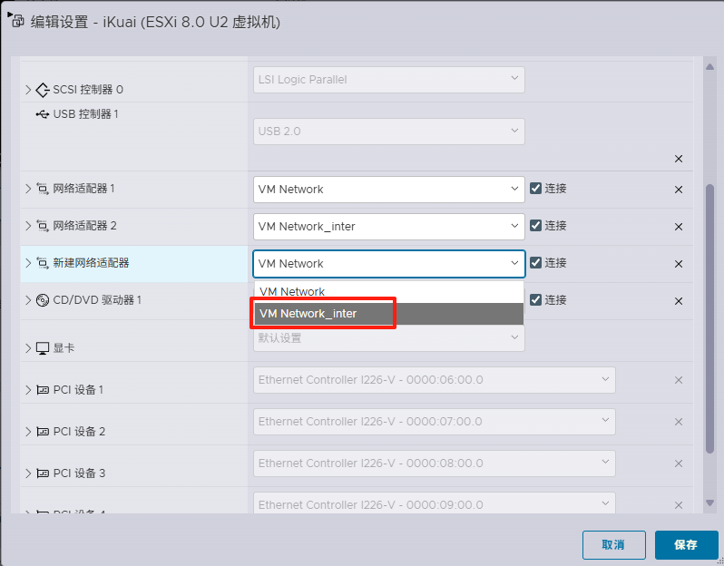 本次配置仅有一台硬件设备,自然是没法把网线插到网口进行直接的路由了,故需要通过ESXI的虚拟机功能,将爱快与OpenWRT两台设备相连,模拟两台设备端口相连的环境