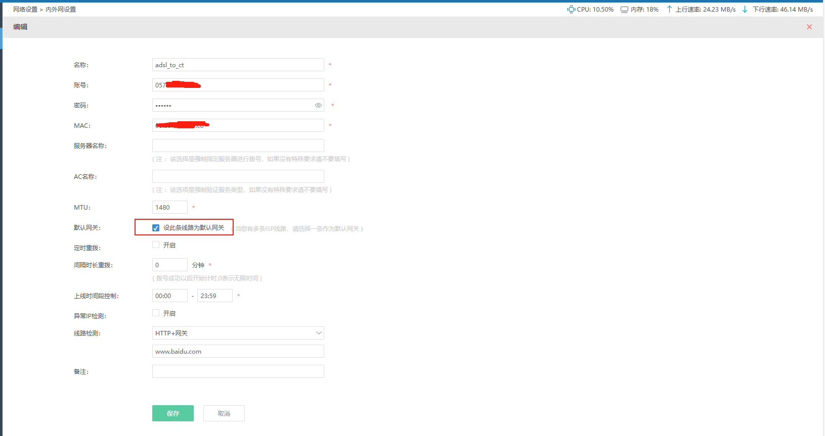 博主的接入环境中,由于中国电信的接入带宽较大,故将中国电信作为默认网关