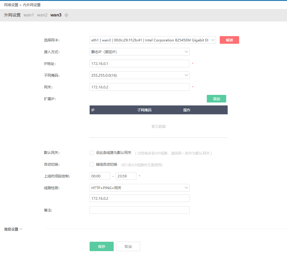 - wan3与中国移动均不通时,走中国电信出口