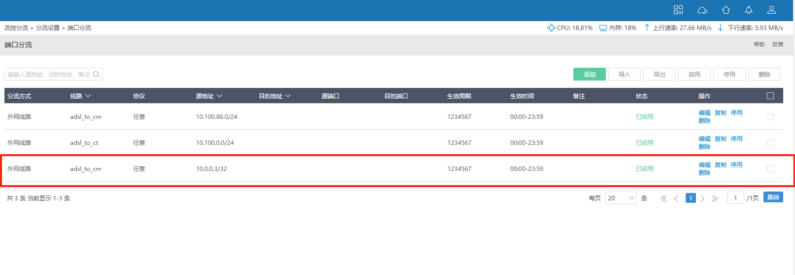 该路由策略多出口间互为备用,保证了网络的稳定性,即便在某个接口断开时,也不影响网络的畅通