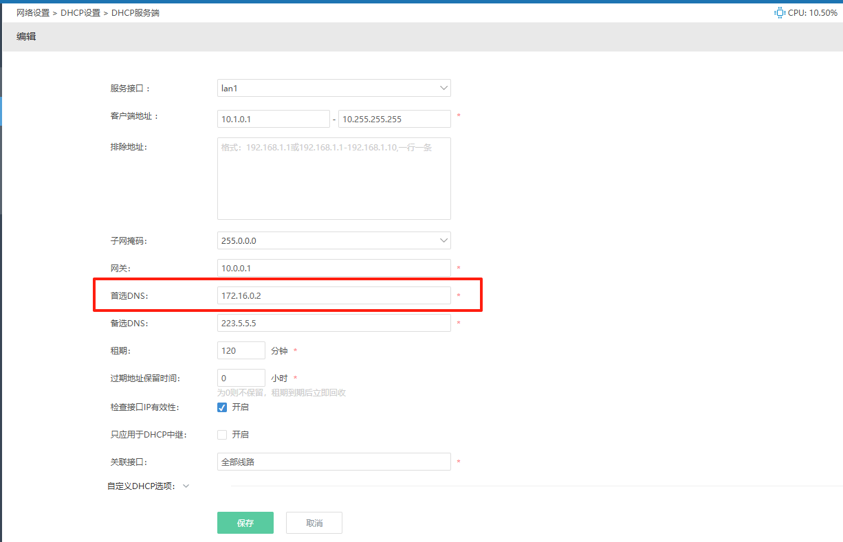 当中,可将首选DNS 改为OpenWRT的内部互联地址(博主此处为172.16.0.2)