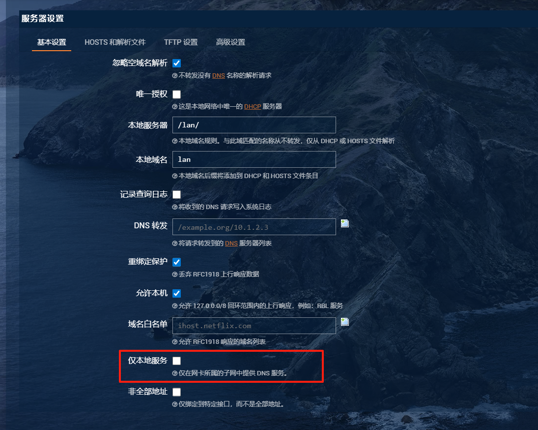 当中,取消勾选 仅本地服务 以保证此DNS可被其网段的用户使用