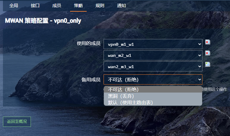 3.在vpn0接口离线,且wan接口也离线的情况下,使用成员==wan2_m3_w1