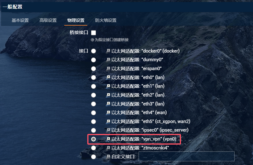 博主使用的OpenWRT已经配置好了vpn0接口,仅需简单配置即可使用,其中,网卡协议选择DHCP,在物理设置中,将接口选择为sevpn-client创建的适配器,如下图