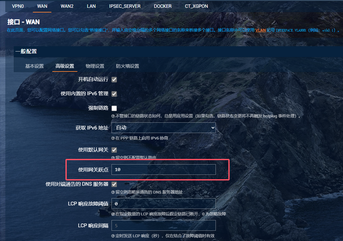 中,将WAN的跃点数设为10,WAN2保持默认