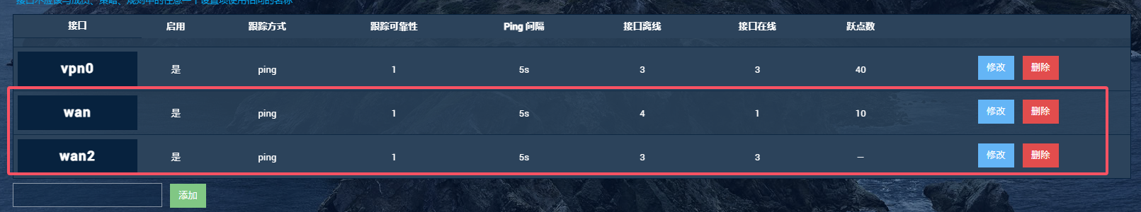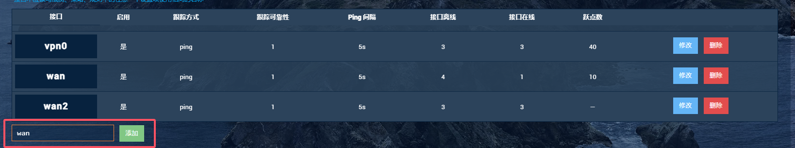 ,即优先走wan出口(移动),wan离线的情况下走wan2(电信)出口