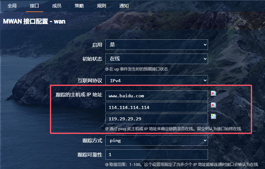 在接口配置中,设置跟踪的主机或IP地址,用于检测链路是否在线