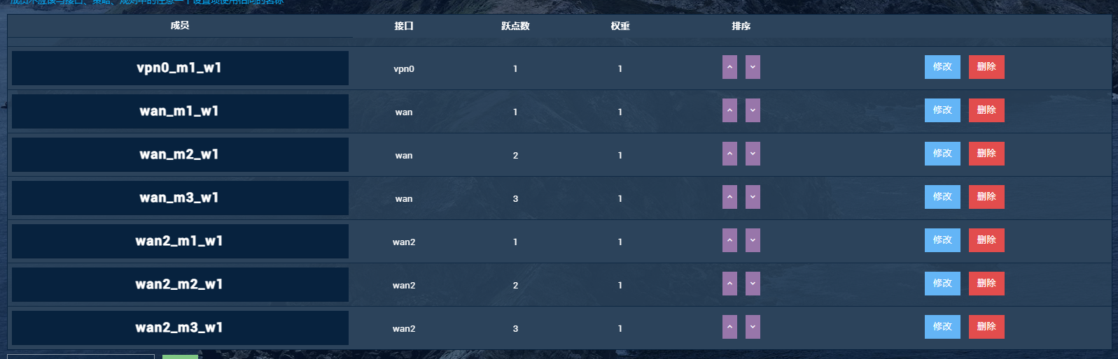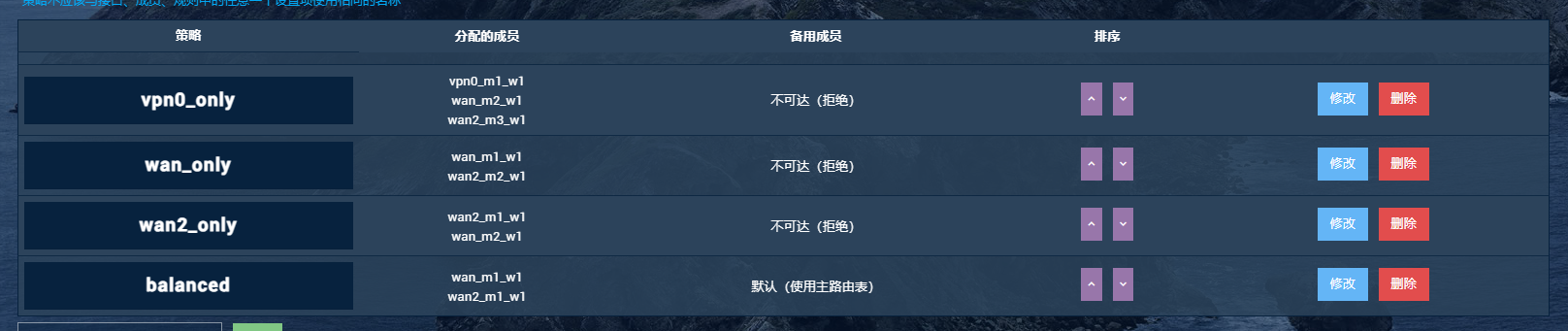 此次配置中,对 wan 和 wan2口各配置了3个成员,vpn0则仅配置了1个成员,==相同接口的3个成员之间仅存在跃点数(即接口优先级)的区别,其它方面均无差别==,对应三种路由策略,即: