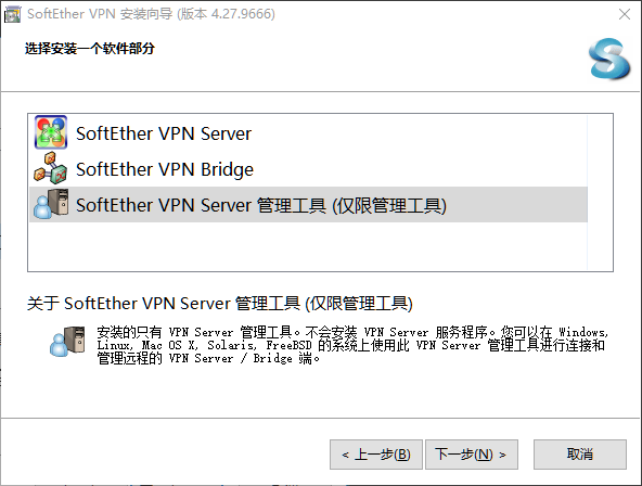 SoftEther VPN Server一大特点在于方便的远程管理功能。以Windows为例,首先到http://www.softether-download.com/cn.aspx 上选择SoftEther VPN Server Manager for Windows,然后下载安装,安装的时候选择仅限管理工具的一项即可。