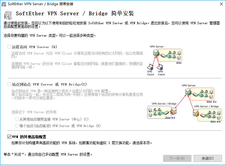 首次成功连接服务器后,会弹出简单安装窗口,选择VPN的其他高级设置,点击关闭即可。