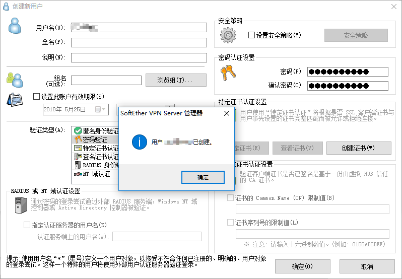 点击管理虚拟HUB,再点击管理用户,在管理用户界面里点新建,输入用户名和密码,点击确定。