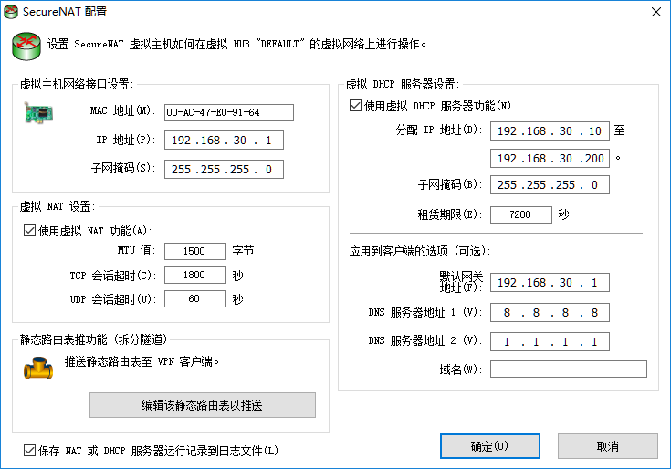 关闭用户管理回到管理虚拟HUB的界面,点击右下边的 虚拟NAT和虚拟DHCP功能(SecureNAT)按钮,点击启用SecureNAT,在进入SecureNAT设置。