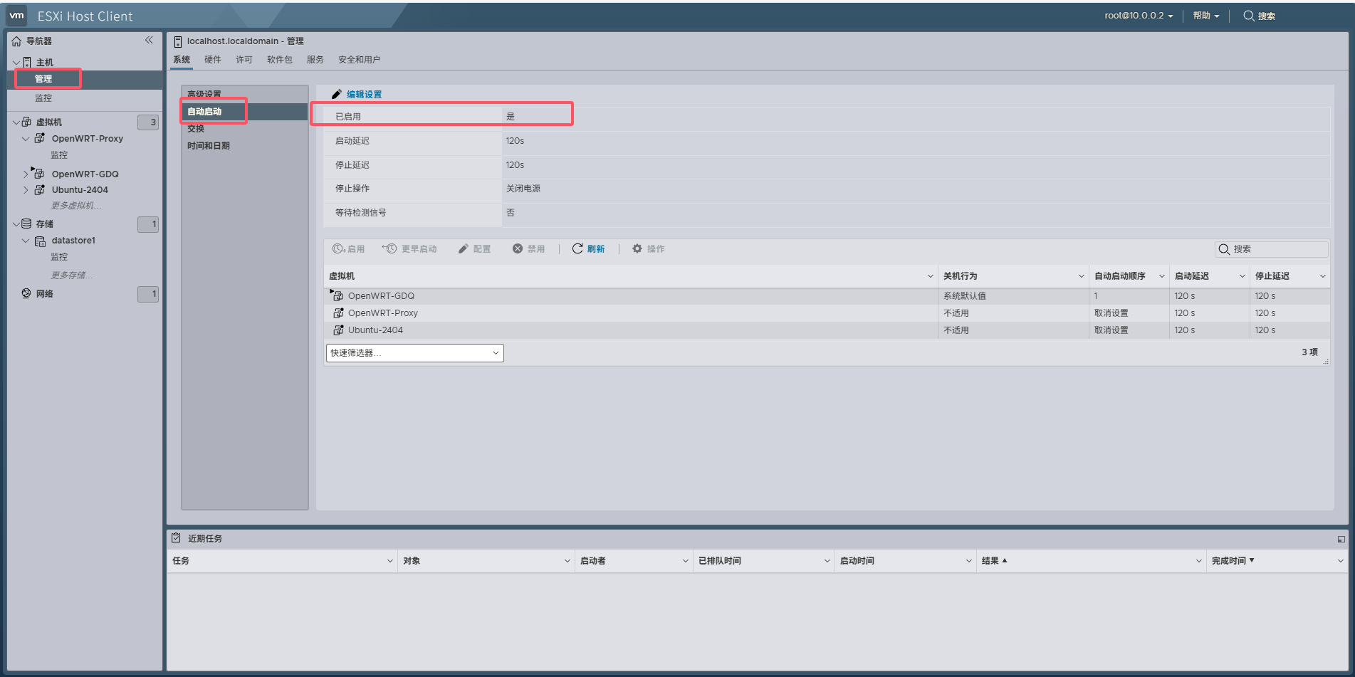 博主在使用ESXI过程中需要使用到虚拟机自动启动的功能,设置后发现依然无法生效,故查阅资料后将配置过程记录于此